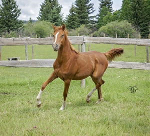 Cheyenne foaled a beautiful chestnut colt by My Lukkhe Starr. He has cute head, beautiful angles, an amazing temperament and is a total sweetheart! He is double Khemosabi foal. A really nice cross and a really well put together colt! Unfortunately there was a snow storm the night after he was born and other horses broke him out of his warm stall. He got sick and cold and we couldn't save him. He will always be remembered as a neat baby and a fighter who did try to stay with us. We miss you little Hardy Boy!
